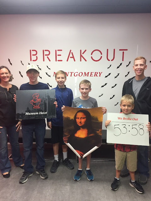 Ethan requested going to Breakout Montgomery for his birthday. We had one hour to solve lots of clues and breakout of the room with the Mona Lisa! We completed the mission in 53:58 minutes!